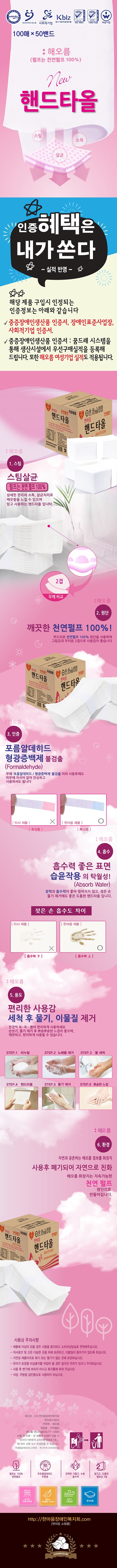 특징 : 재생 원지를 사용하여 2겹 엠보싱 처리로 부드럽고 기존 자사 핸드타월 대비2배 정도의 흡수력과 강도가 높습니다. 100매씩 비닐포장되어 있어 위생적이며 사용이 편리합니다. 케이스에 보관하여 한장씩 뽑아 사용하기에 적합하고 수건대용품으로 사용하기 좋습니다.