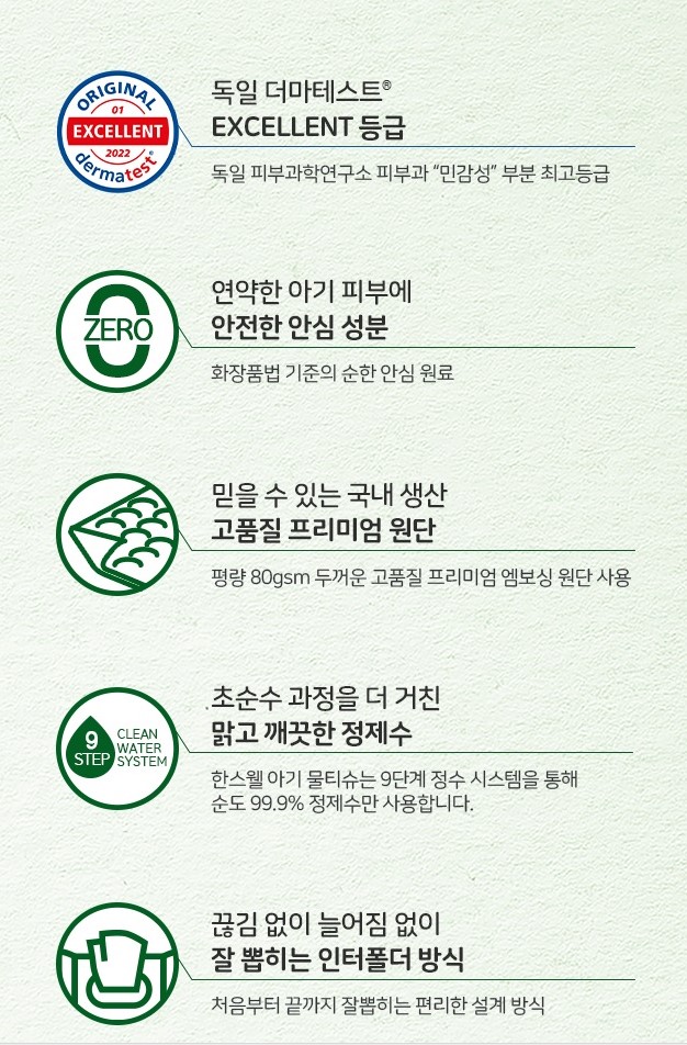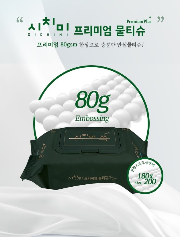 평량 80gsm,9단계 정수시스템, 프리미엄 엠보싱원단, 피부저자극테스트 완료,