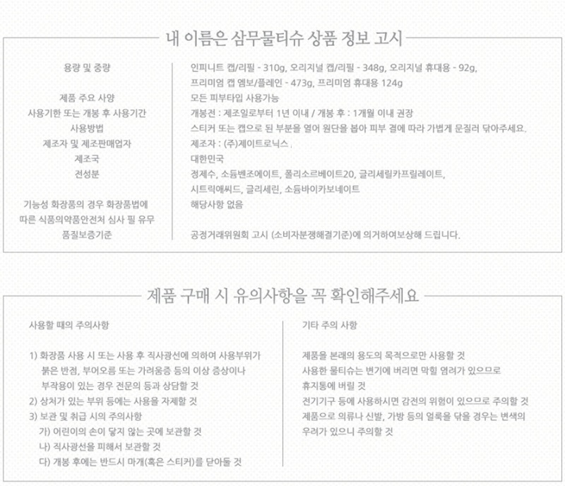 거래조건 : 부드럽고 편안한 사용감을 제공하는 삼무물티슈 오리지널 캡형입니다.