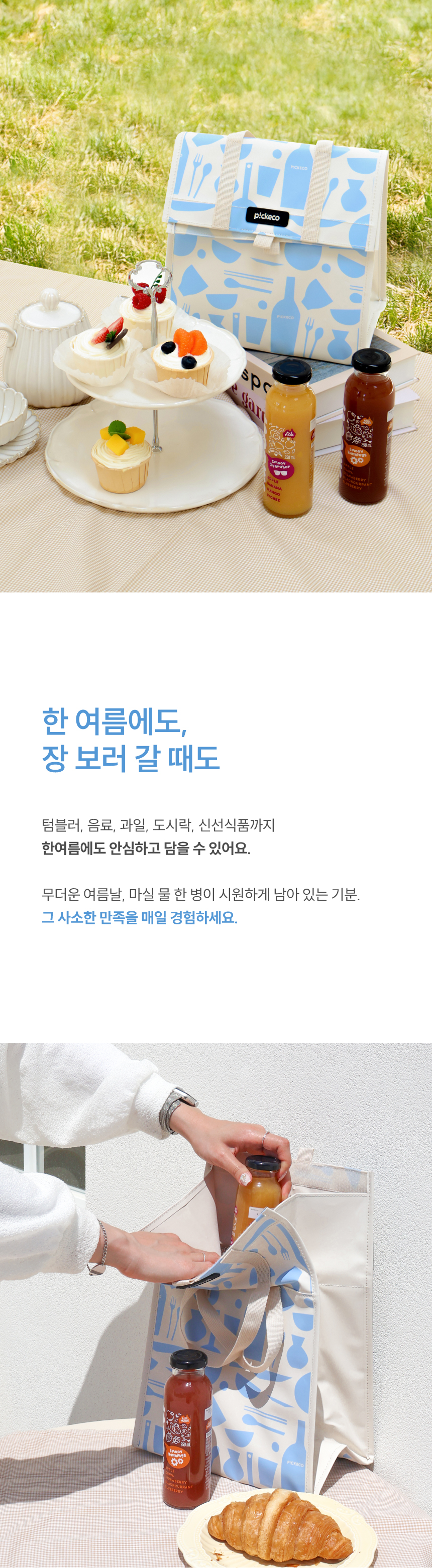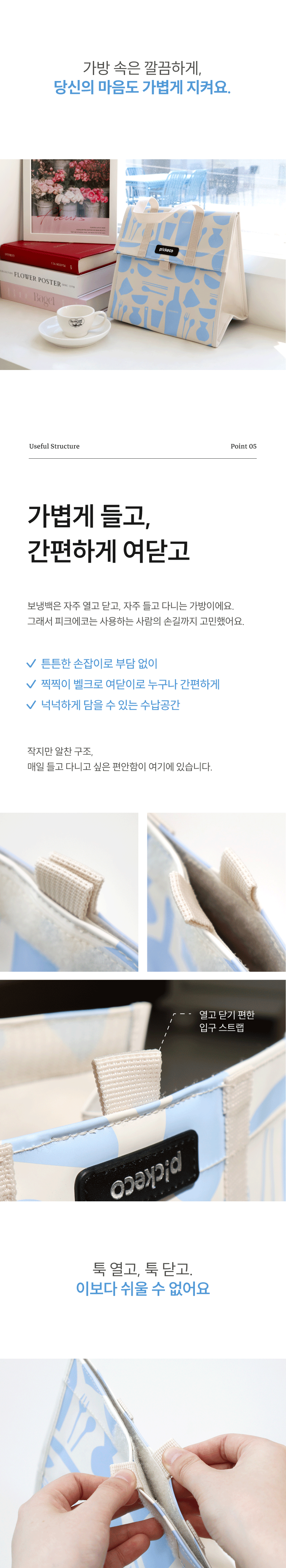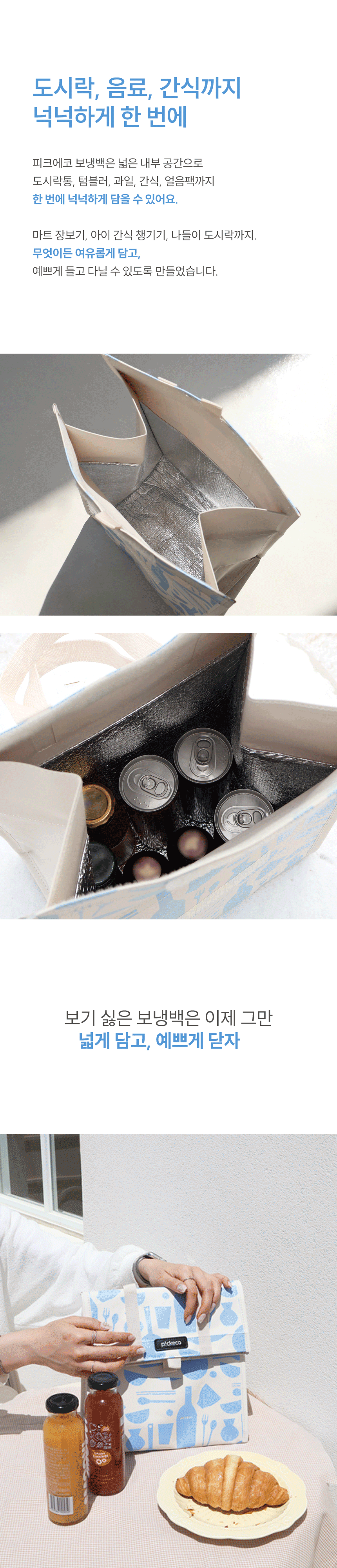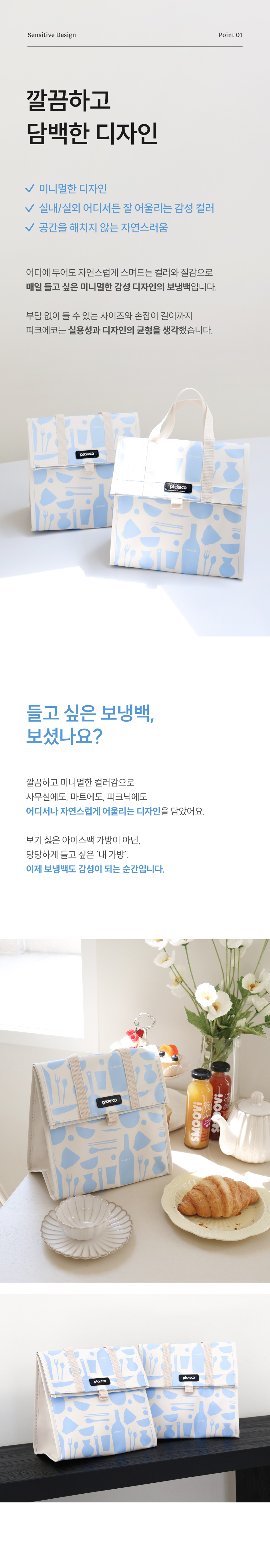 가벼운 피크닉, 이유식 가방 등으로 가능한 보냉백. 생활방수가 가능하고 오염에 강한 원단을 사용하였으며 단열재가 내장되어 식료품 보관이 용이한 가방
