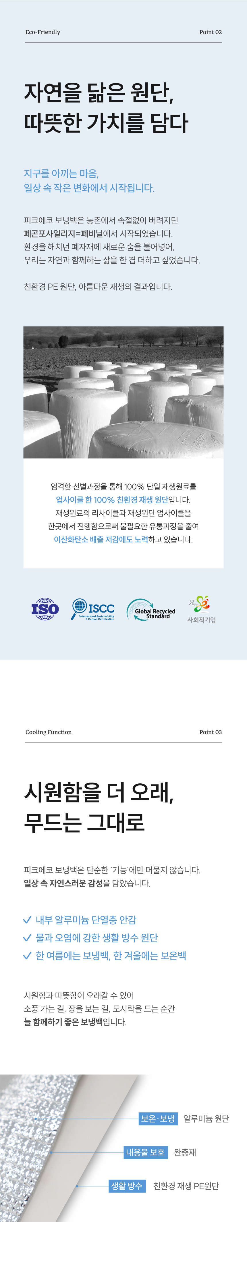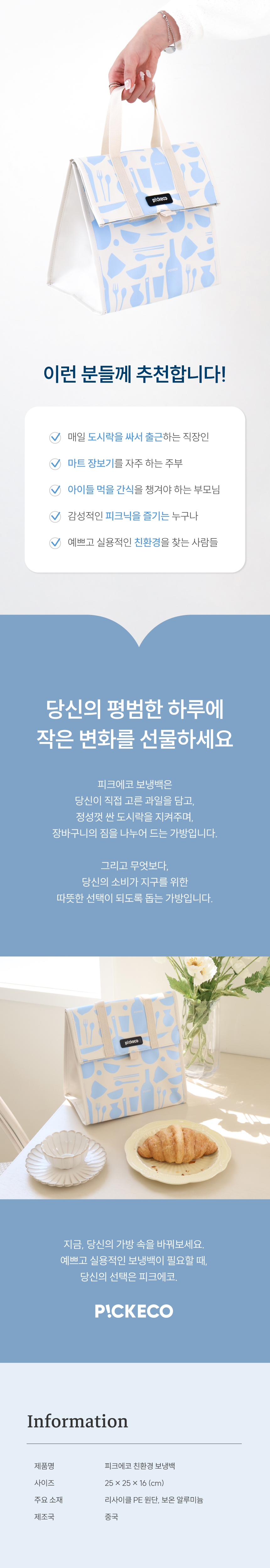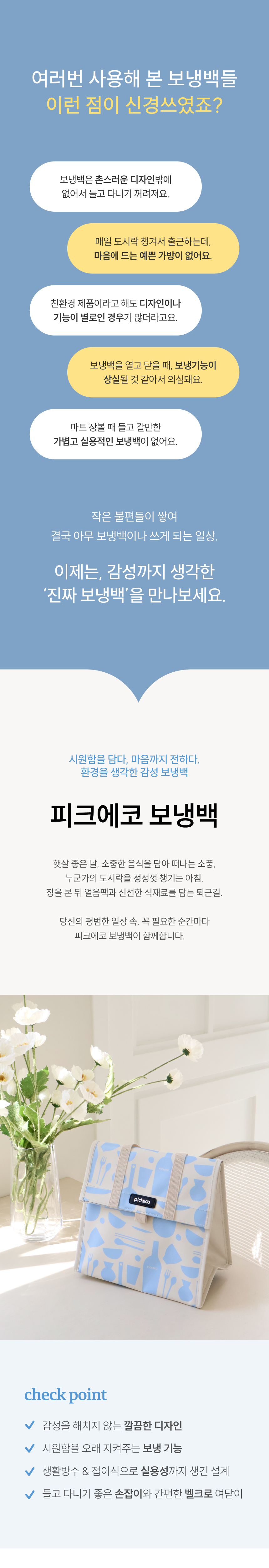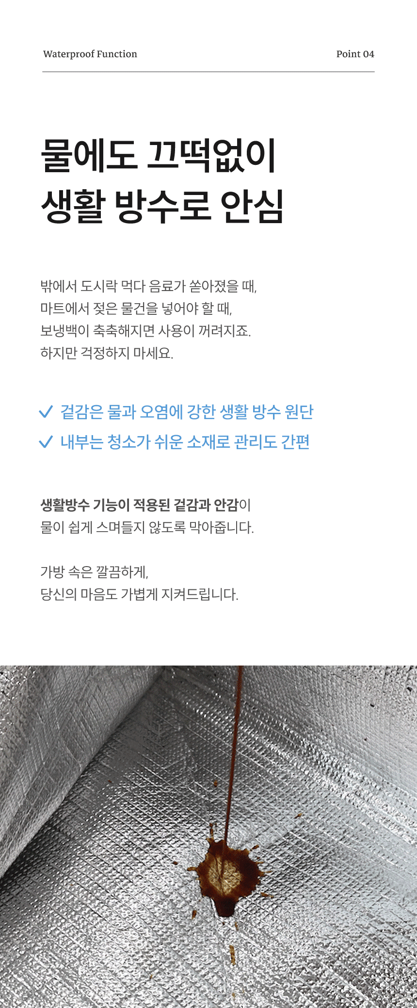 가벼운 피크닉, 이유식 가방 등으로 가능한 보냉백. 생활방수가 가능하고 오염에 강한 원단을 사용하였으며 단열재가 내장되어 식료품 보관이 용이한 가방