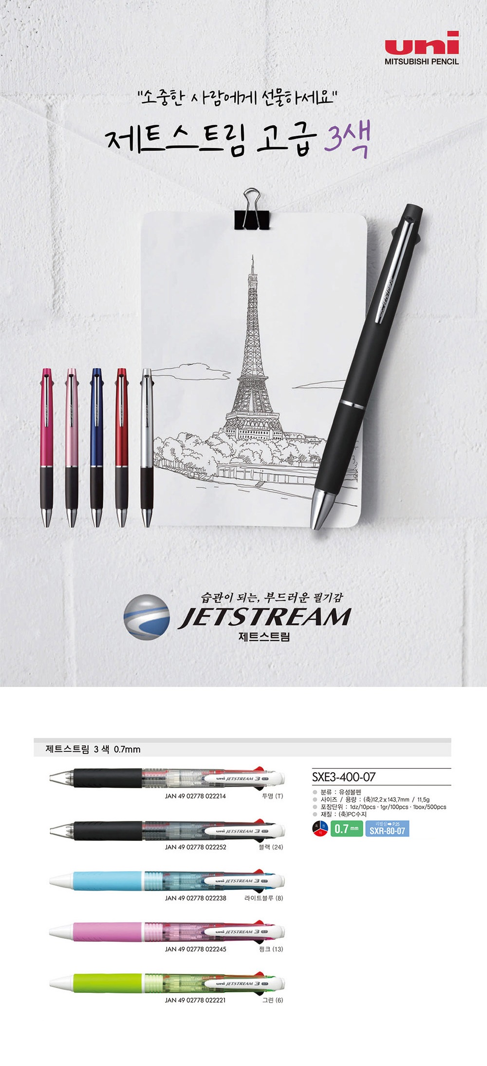 제트스트림 3색 볼펜 SXE3 - 400 - 07 [투명]_(0.7mm/흑+청+적)